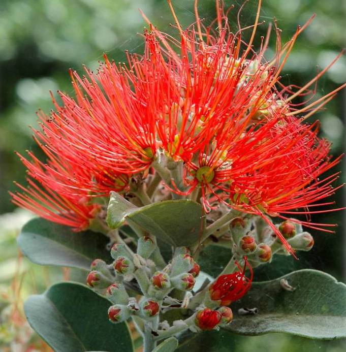 - Metrosideros excelsa: o M. tomentosus in estate produce cime terminali compatte, con fiori lunghi 3-4 cm con filamenti rossi ed antere dorate. Nelle zone di origine da adulto può raggiungere 20 m di altezza e 10 di larghezza